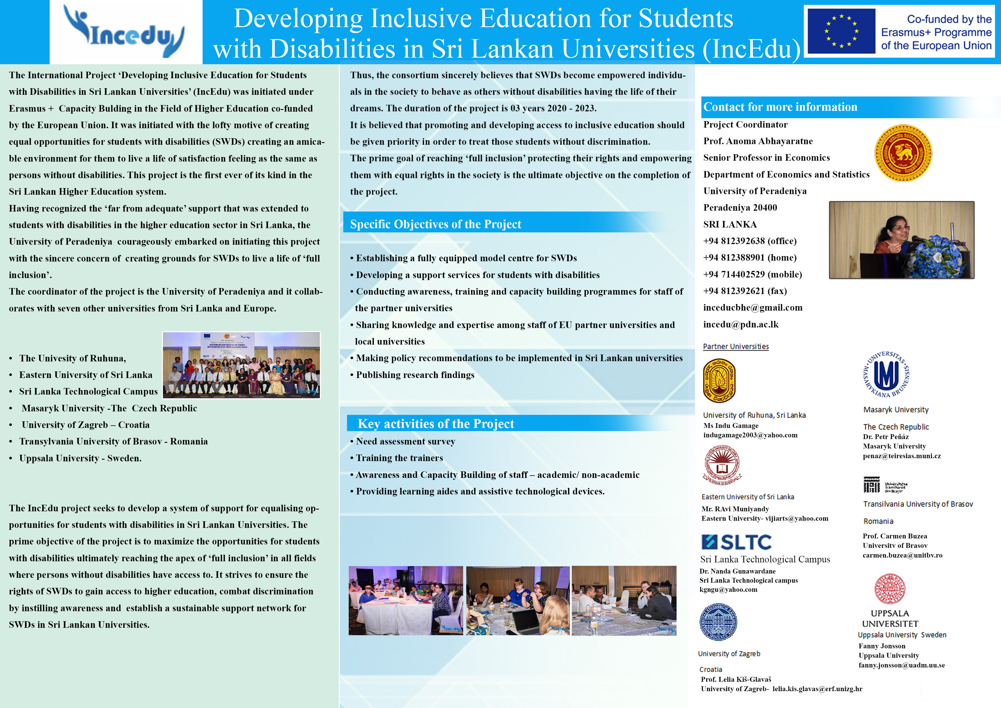 The IncEdu project addresses a significant issues in higher education in Sri Lanka that have not received adequate attention. It intends to develop a system of support for equalizing opportunities for students with disabilities in Sri Lankan Universities. The main activities of the project during the period of 3 years (2020-2023), include, creating community awareness, develop competency of staff of the partner universities in Sri Lanka and to establish a model support center with required equipment and assistive technology. It is believed that promoting and developing access to inclusive education should be given priority in order to treat those students without discrimination and to protect their rights.